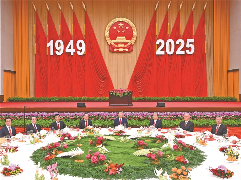 在欢快的乐曲声中,中外宾朋举杯共贺中华人民共和国成立76周年,祝福中国繁荣昌盛、人民幸福安康,祝愿中国人民和世界各国人民友谊长存。
