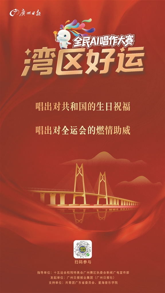 广州日报讯 在庆祝中华人民共和国成立76周年之际,让我们用歌声传递对新中国的生日祝福,唱出对祖国的深情告白!扫描海报上的活动二维码或通过广州日报微信下拉菜单、广州日报新花城客户端活动专页,即可进入广州日报“湾区好运”AI音乐创作平台,生成属于自己的音乐作品,更有总价值约3万元的现金彩蛋和十五运会吉祥物文创产品等你来拿。