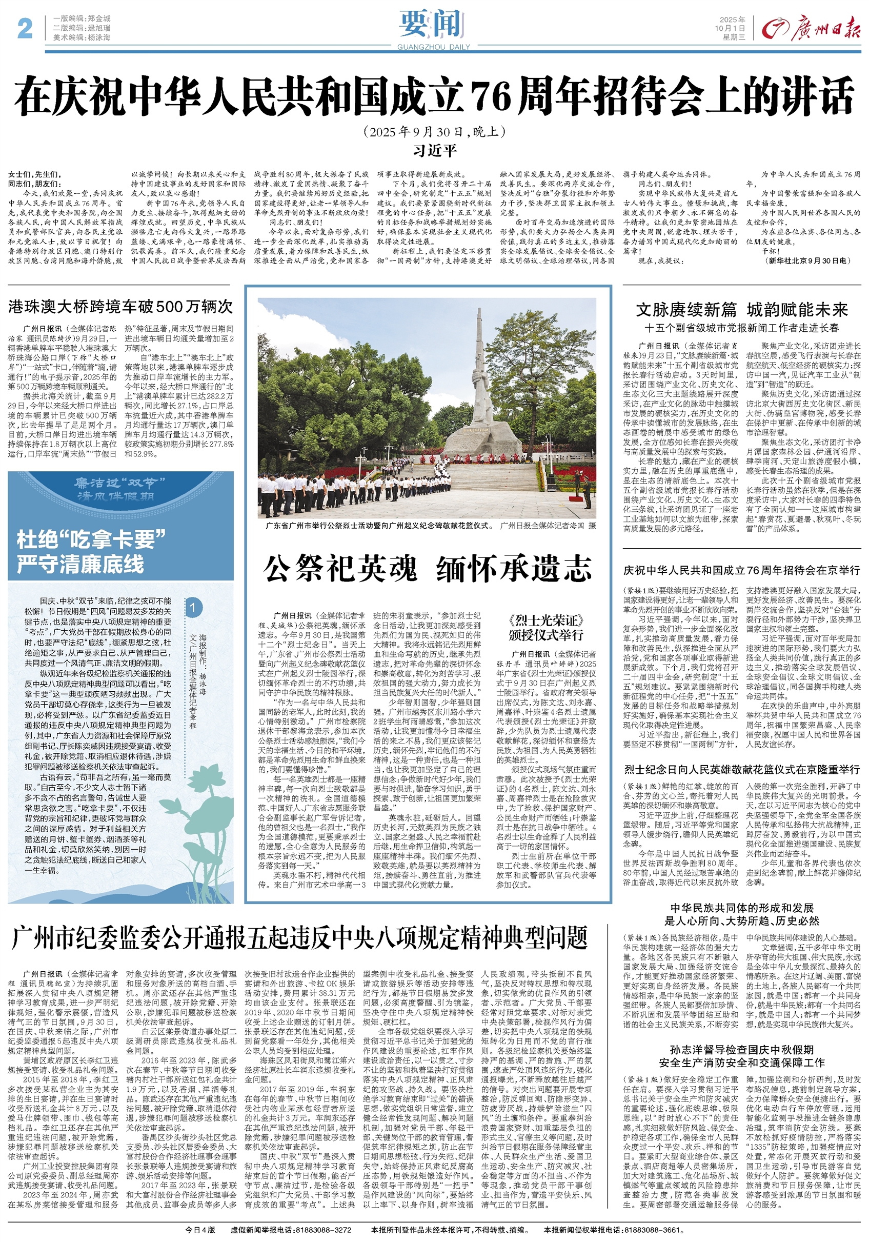- 庆祝中华人民共和国成立76周年招待会在京举行 (紧接1版)要继续用好历史经验,把国家建设得更好,让老一辈领导人和革命先烈开创的事业不断欣欣向荣。 习近平强调,今年以来,面对复杂形势,我们进一步全面深化改革,扎实推动高质量发展,着力保障和改