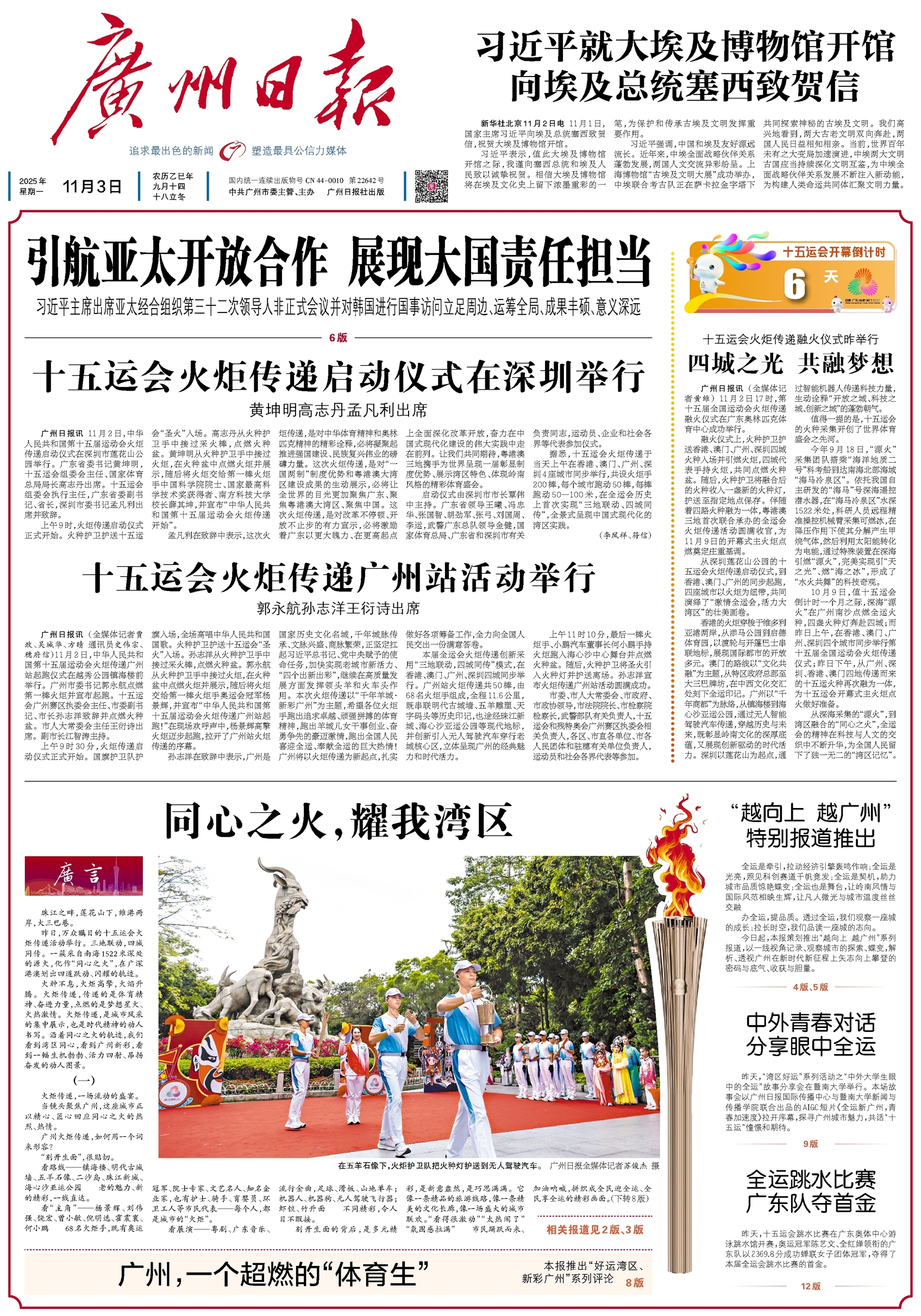 - “越向上 越广州”特别报道推出 全运是牵引,拉动经济引擎轰鸣作响;全运是光亮,照见科创赛道千帆竞发;全运是契机,助力城市品质惊艳蝶变;全运也是舞台,让岭南风情与国际风范相映生辉,让凡人微光与城市温度丝丝交融…… 办全运,提品