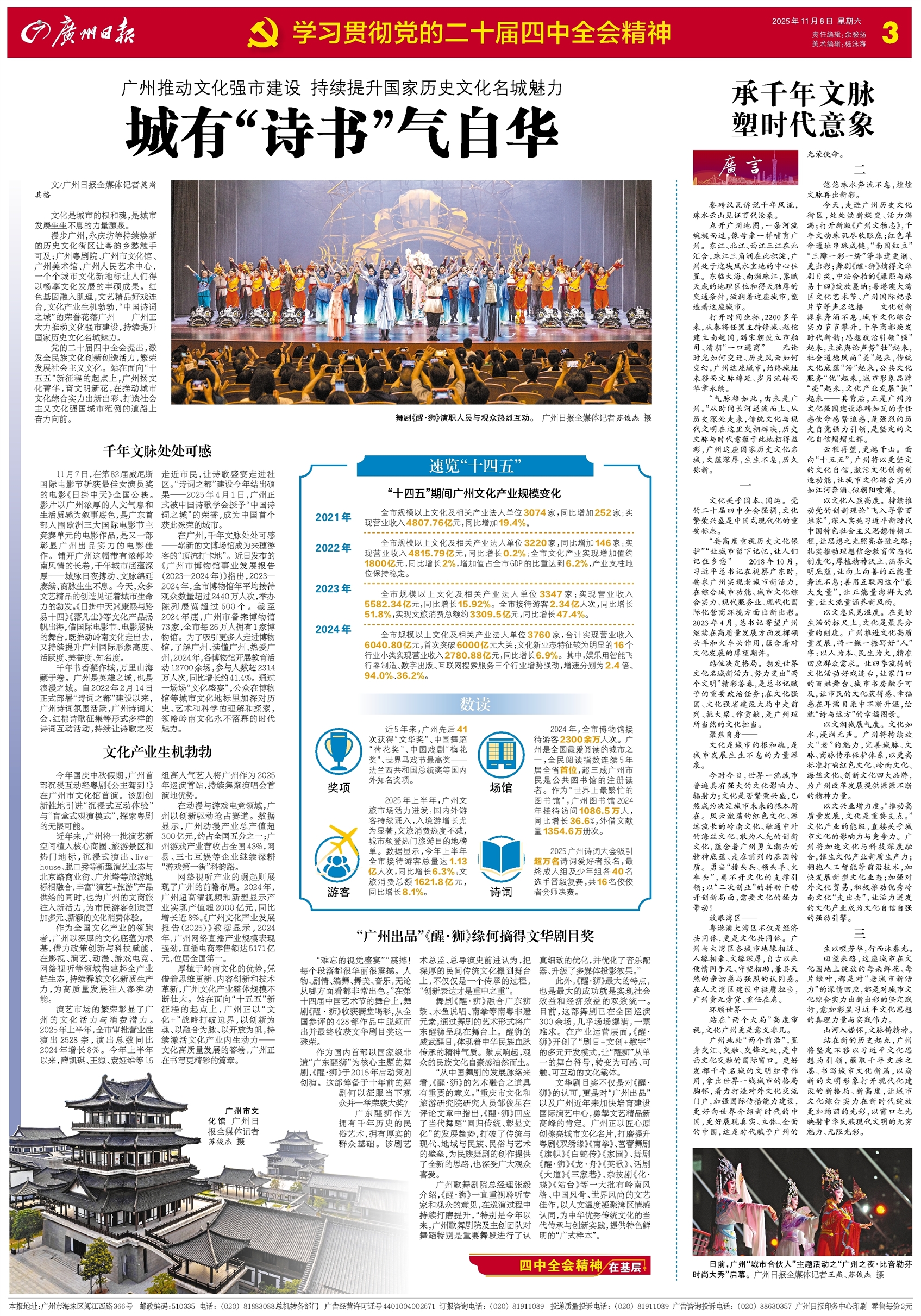 四中全会精神在基层 文/广州日报全媒体记者莫斯其格 文化是城市的根和魂,是城市发展生生不息的力量源泉。 漫步广州,永庆坊等持续焕新的历史文化街区让粤韵乡愁触手可及;广州粤剧院、广州市文