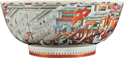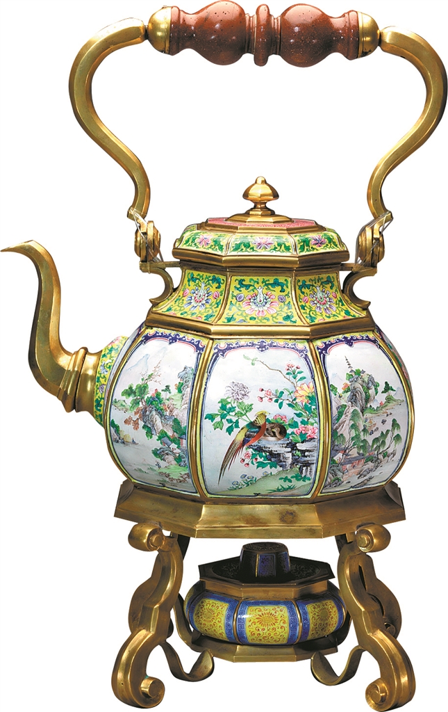 18世纪欧洲釉上彩工艺——画珐琅自海路传入广州后,为中国彩釉技术注入新的力量。尤其是风靡欧洲数百年的紫红、粉红,被大量运用于外销粉彩、广彩瓷之上。故宫博物院中收藏的清乾隆款画珐琅八棱开光山水花鸟图提梁壶、广东省博物馆收藏的清康熙款珐琅彩花碟纹碗,都是这种交流的结晶。
