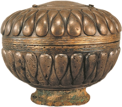 1983年,南越文王赵眜的陵墓在广州象岗山被发现。墓中出土的银盒,全身装饰着捶打而成的蒜形交错凸纹,盒盖和盒身复合处镌刻着穗状鎏金带纹。这样的风格并不见于汉代本土器皿,却能在波斯阿契美尼德王朝的金银器中找到相似的标本。银盒传入中国后,工匠们在盖面上焊上3个小凸榫,套上中国风的羊钮饰,刻上隶书的王宫藏品编码,再在底部加上一道圈足,一件典型的“洋为中用”器物宣告完成。而墓中的非洲象牙、阿拉伯乳香、燃烧东南亚树脂香料的香炉以及带有两河流域风格的焊珠金花泡等,显然也都是舶来品。