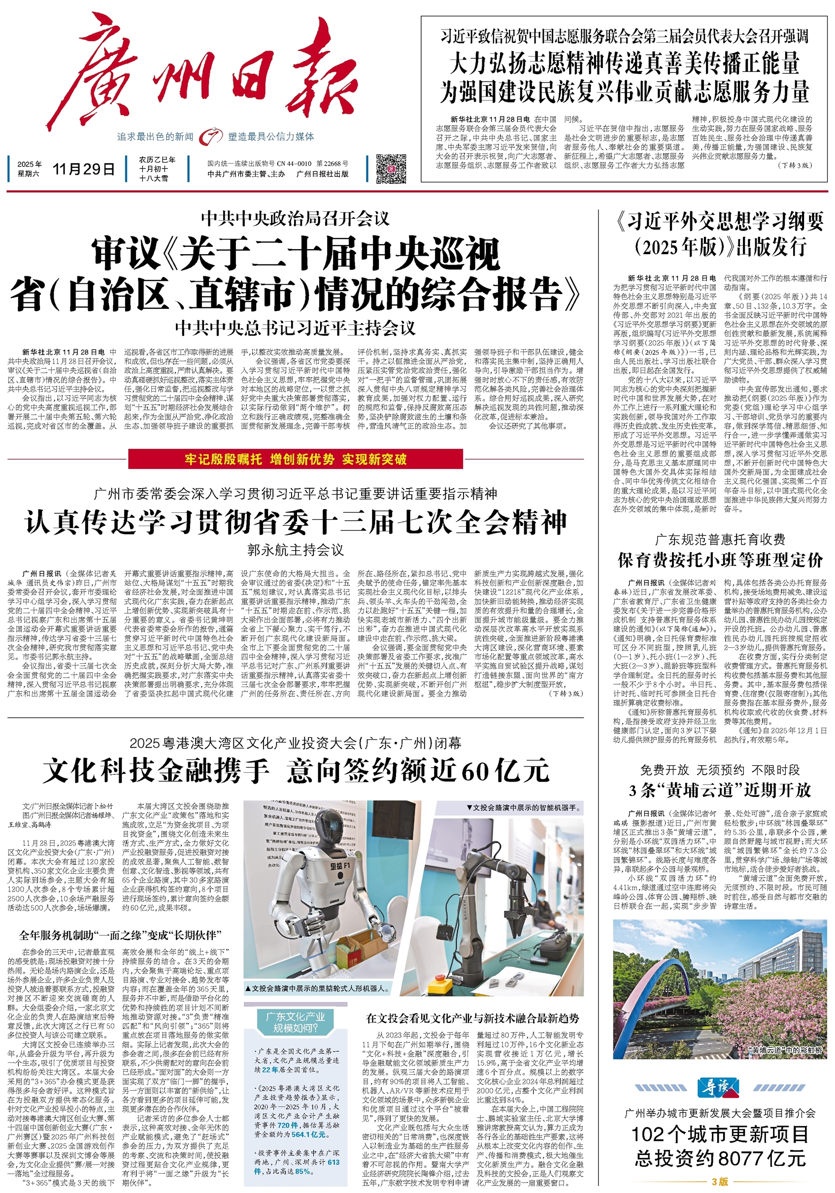 - 认真传达学习贯彻省委十三届七次全会精神 广州日报讯 (全媒体记者吴城华 通讯员史伟宗)昨日,广州市委常委会召开会议,套开市委理论学习中心组学习会,深入学习贯彻党的二十届四中全会精神、习近平总书记视察广东和出席第十五届全国运动会开幕式重要
