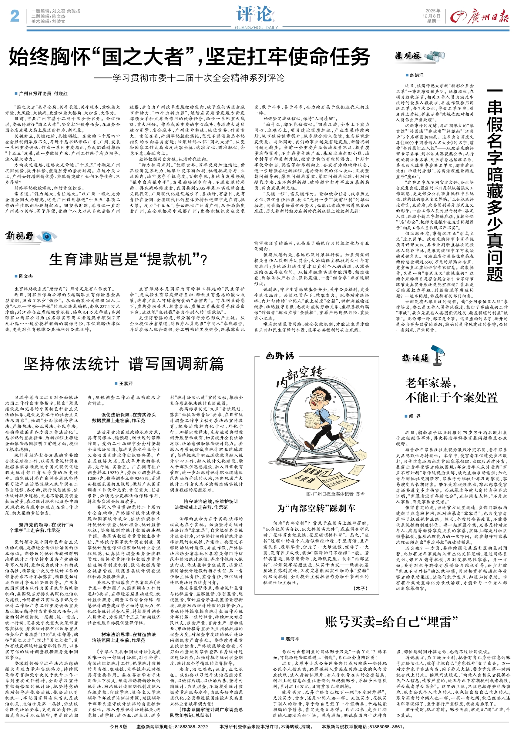 - 始终胸怀“国之大者”,坚定扛牢使命任务 广州日报评论员 付迎红 “国之大者”关乎全局、关乎长远、关乎根本,意味着大考验、大风险、大挑战,更意味着大格局、大担当、大作为。 日前,中共广州市委十二届十次全会召开。会议强调,要始终胸怀