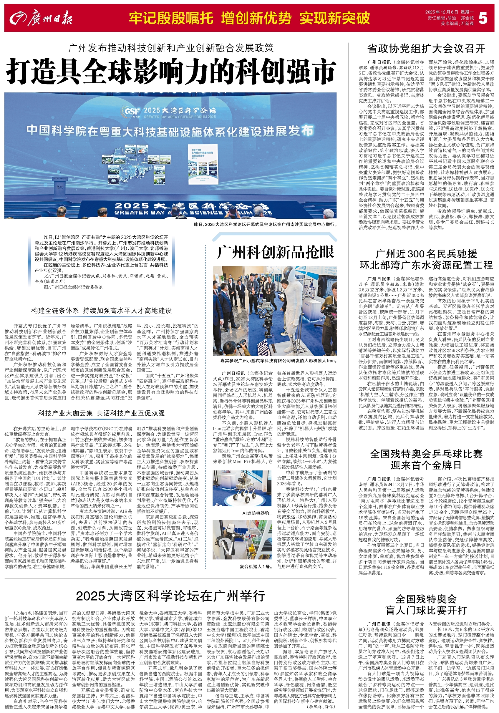 - 打造具全球影响力的科创强市 昨日,以“智创湾区 产研共融”为主题的2025大湾区科学论坛开幕式及主论坛在广州南沙举行。开幕式上,广州市发布推动科技创新和产业创新融合发展政策,香港科技大学(广州)、澳门大学、北师香港浸会大学等