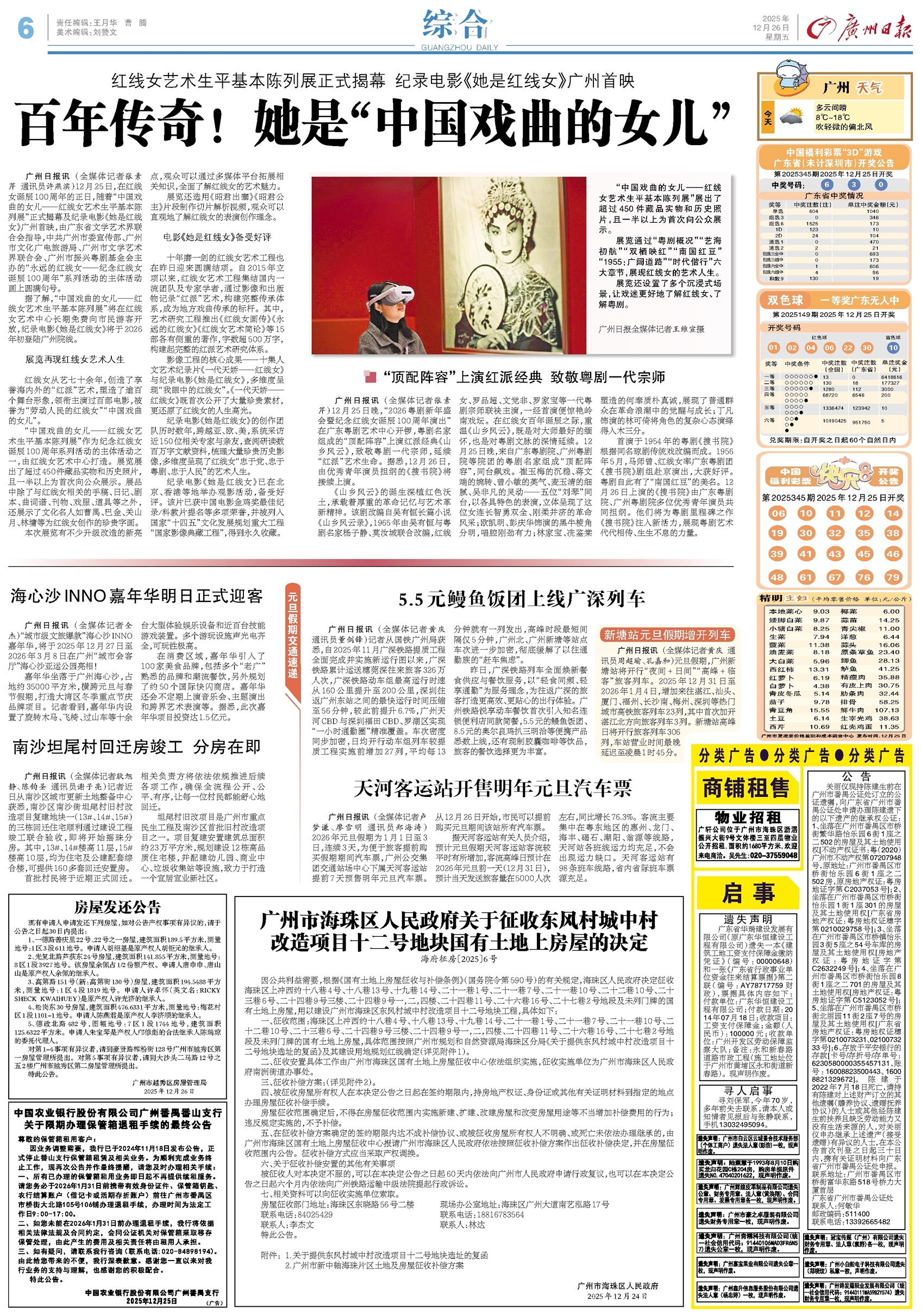 - “顶配阵容”上演红派经典 致敬粤剧一代宗师 广州日报讯 (全媒体记者张素芹)12月25日晚,“2026粤剧新年盛会暨纪念红线女诞辰100周年演出”在广东粤剧艺术中心开锣,粤剧名家组成的“顶配阵容”上演红派经典《山乡风云》,致敬粤剧一代宗师,