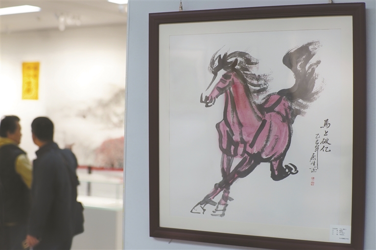 杨殿生是一位多面手,他不仅擅长画山水,也擅长画花鸟。本次展出了他的两幅马画和十余幅猫画作品,他的马画,线条遒劲,刚健传神,他的猫画笔意灵动、墨韵传神,趣味横生,让人忍俊不禁。