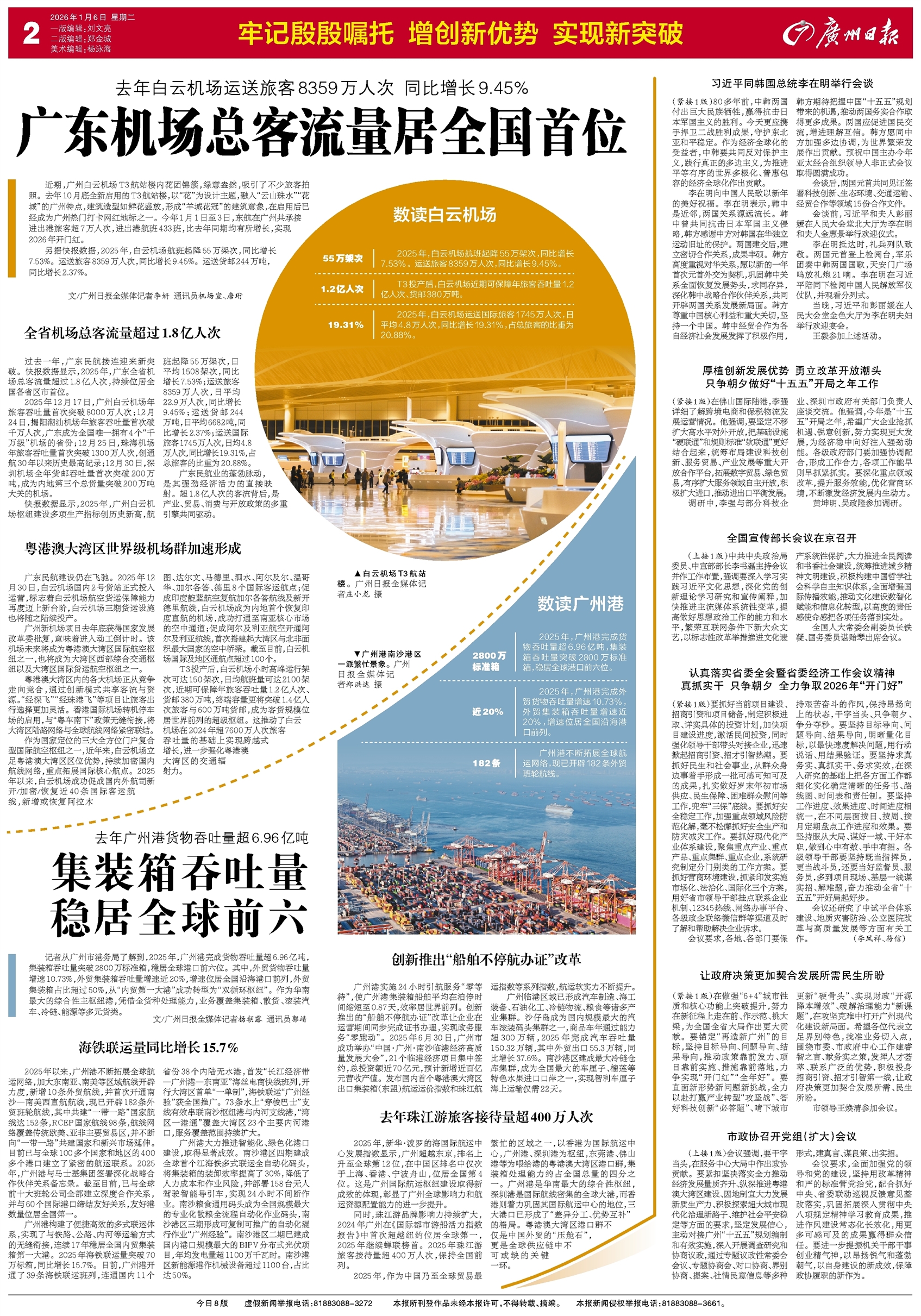 - 集装箱吞吐量稳居全球前六 记者从广州市港务局了解到,2025年,广州港完成货物吞吐量超6.96亿吨,集装箱吞吐量突破2800万标准箱,稳居全球港口前六位。其中,外贸货物吞吐量增速10.73%,外贸集装箱吞吐量增速近20%,