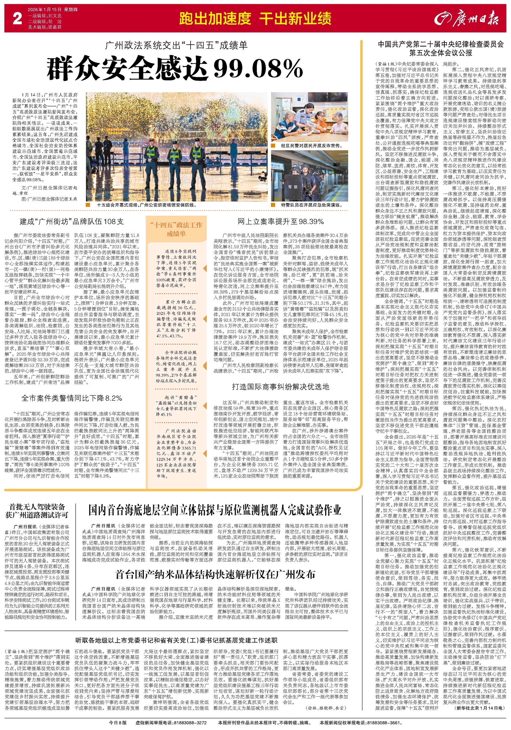 - 群众安全感达99.08% 1月14日,广州市人民政府新闻办公室召开“‘十四五’广州成就”系列发布会——广州“十四五”高质效政法履职新闻发布会,介绍广州“十四五”高质效政法履职的相关情况。一项项成果、一组组数据展现出广州政