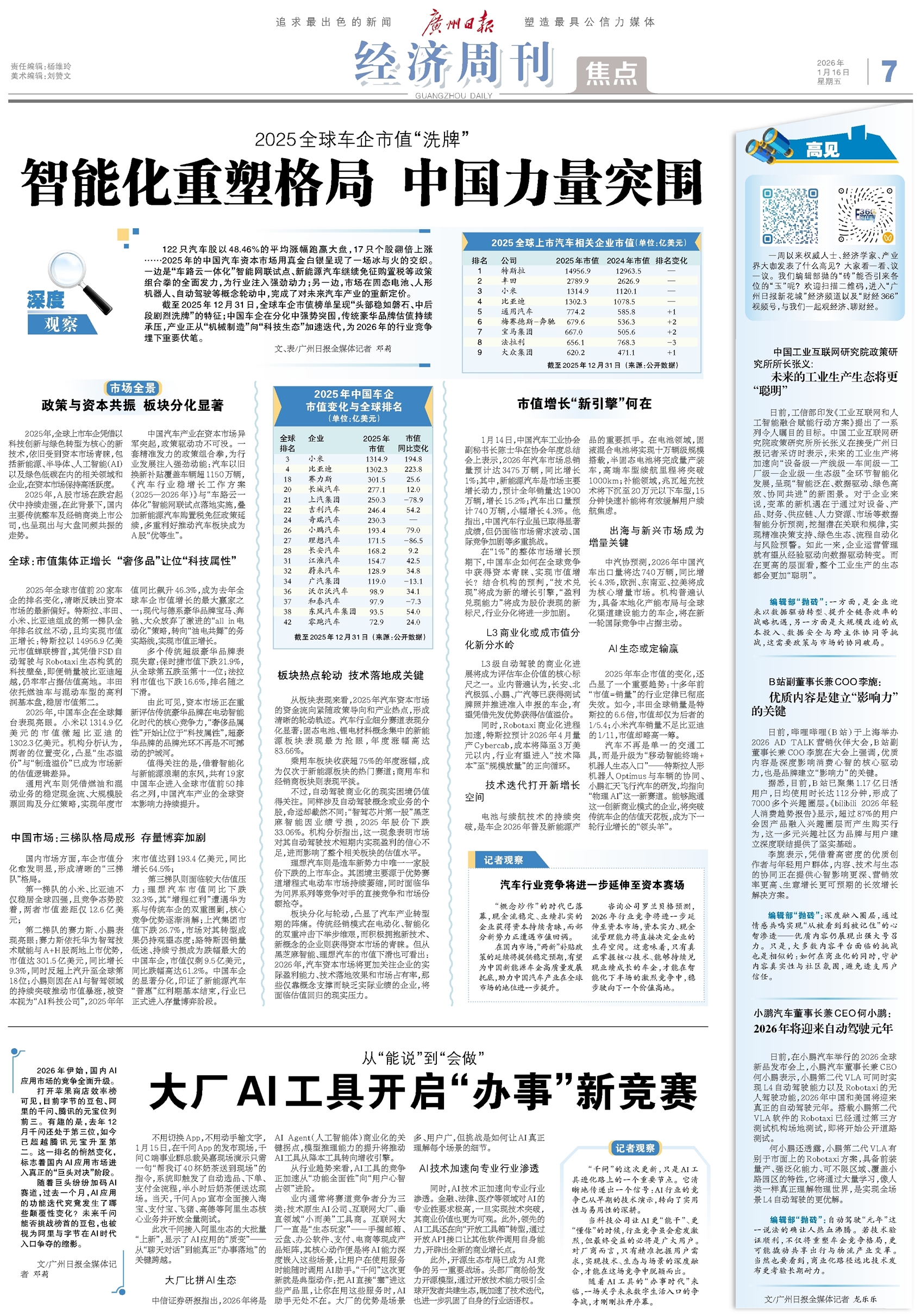 - 智能化重塑格局 中国力量突围 深度观察 122只汽车股以48.46%的平均涨幅跑赢大盘,17只个股翻倍上涨……2025年的中国汽车资本市场用真金白银呈现了一场冰与火的交织。一边是“车路云一体化”智能网联试点、新能源汽车
