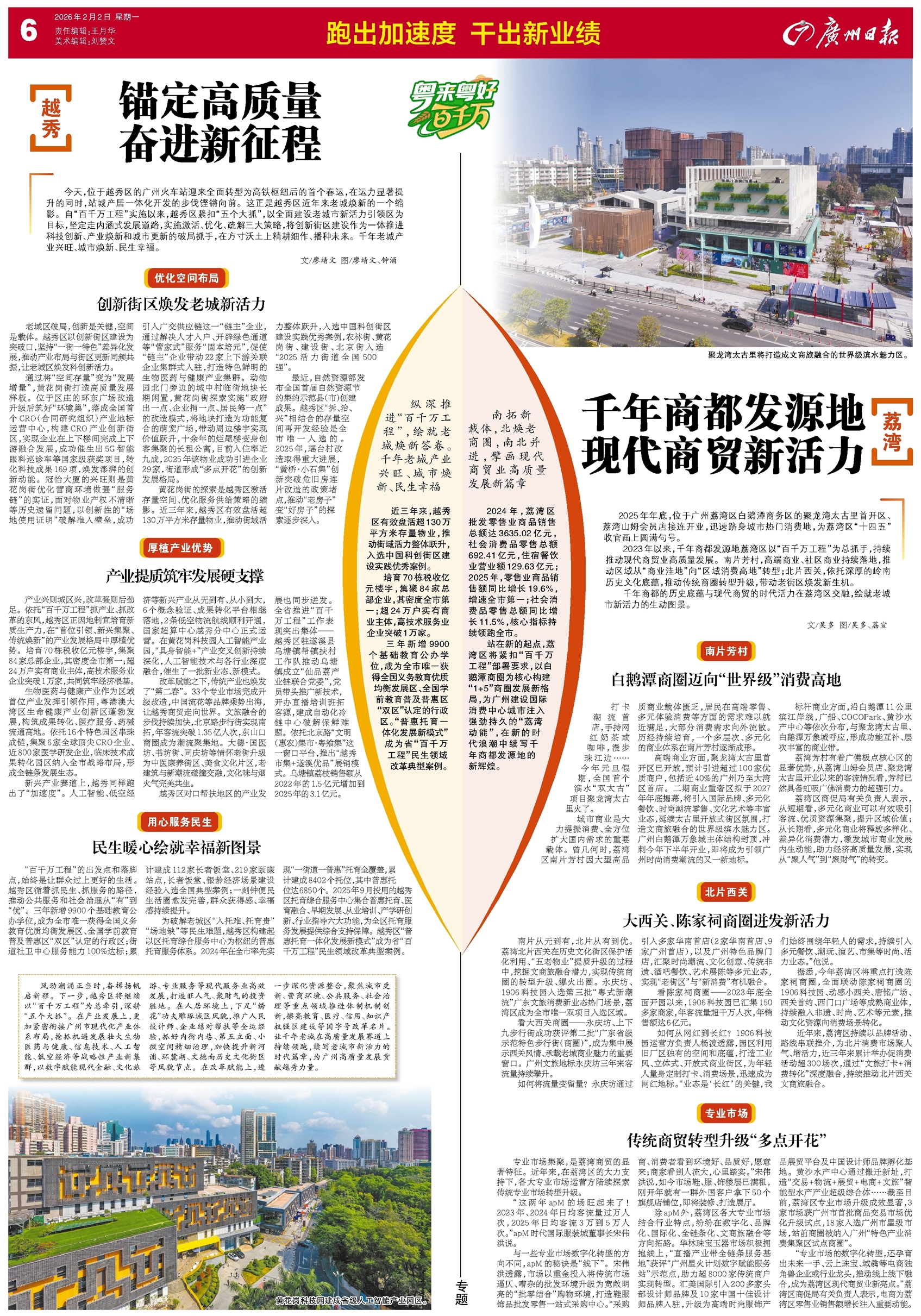 - 荔湾:千年商都发源地 现代商贸新活力 粤来粤好百千万 2025年年底,位于广州荔湾区白鹅潭商务区的聚龙湾太古里首开区、荔湾山姆会员店接连开业,迅速跻身城市热门消费地,为荔湾区“十四五”收官画上圆满句号。 2023年以来,