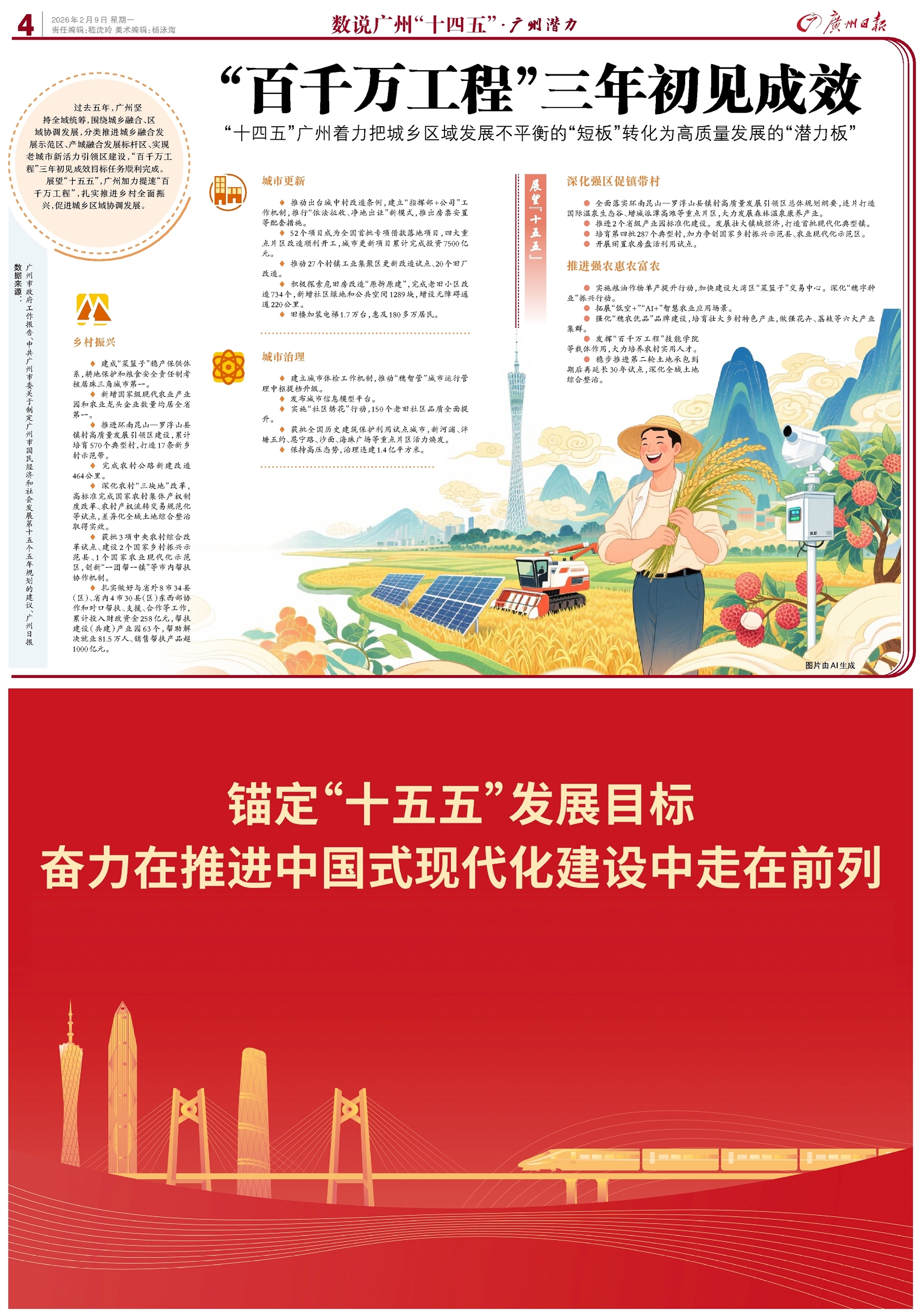 过去五年,广州坚持全域统筹,围绕城乡融合、区域协调发展,分类推进城乡融合发展示范区、产城融合发展标杆区、实现老城市新活力引领区建设,“百千万工程”三年初见成效目标任务顺利完成。 展望“十五