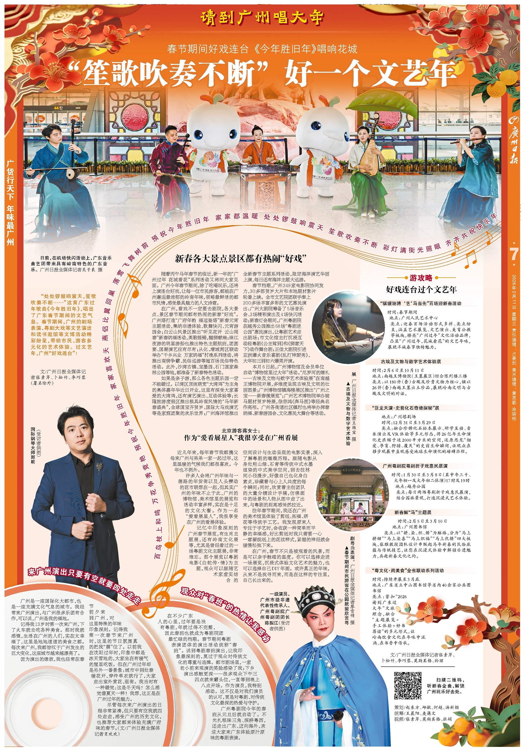 广货行天下 年味最广州 “处处锣鼓响震天,笙歌吹奏不断……”这首广东过年歌曲《今年胜旧年》,唱出了广东春节期间的文艺气息。春节期间,广州的剧场表演、粤剧大戏等文艺演出和读书逛馆等文博活动精