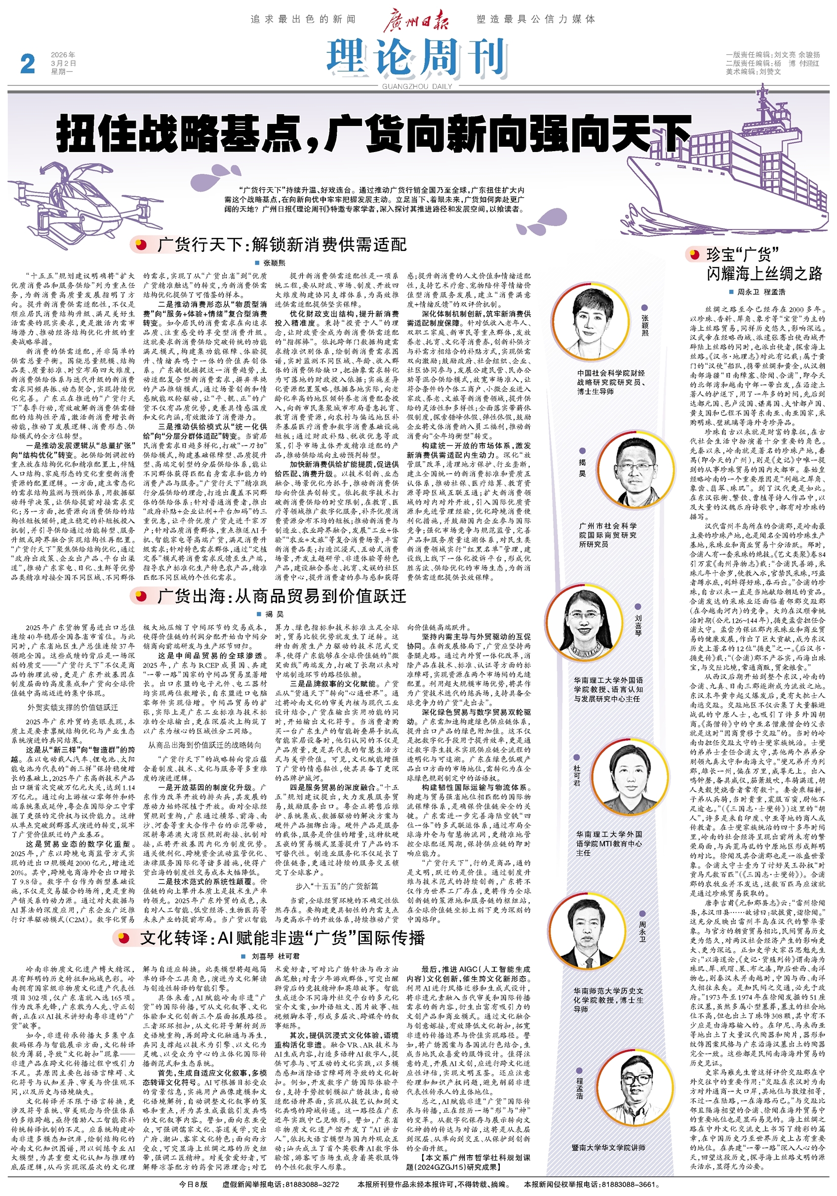 “广货行天下”持续升温、好戏连台。通过推动广货行销全国乃至全球,广东扭住扩大内需这个战略基点,在向新向优中牢牢把握发展主动。立足当下、着眼未来,广货如何奔赴更广阔的天地?广州日报《理论周刊》特邀专