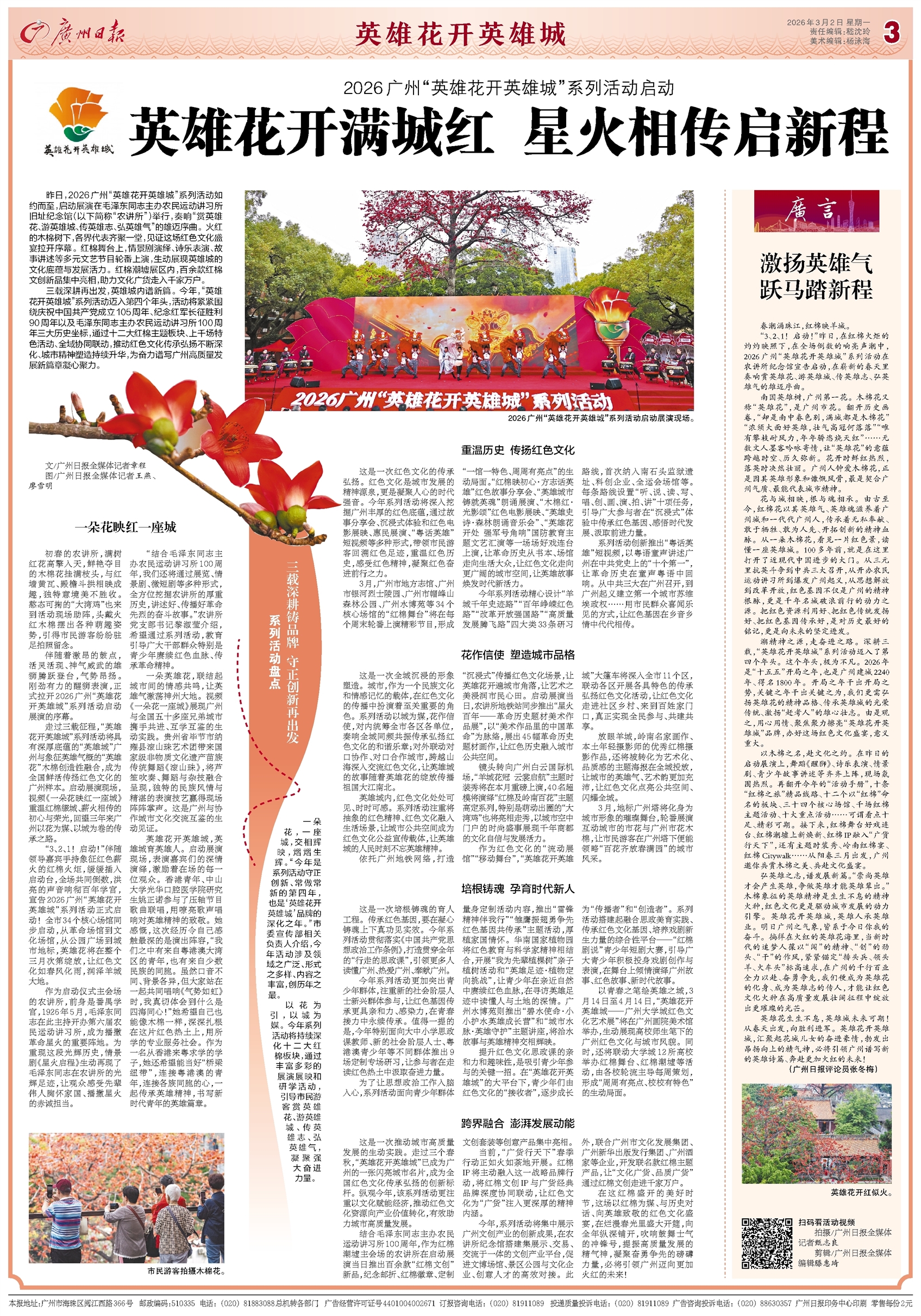 - 英雄花开满城红 星火相传启新程 昨日,2026广州“英雄花开英雄城”系列活动如约而至,启动展演在毛泽东同志主办农民运动讲习所旧址纪念馆(以下简称“农讲所”)举行,奏响“赏英雄花、游英雄城、传英雄志、弘英雄气”的雄迈序曲。火红的