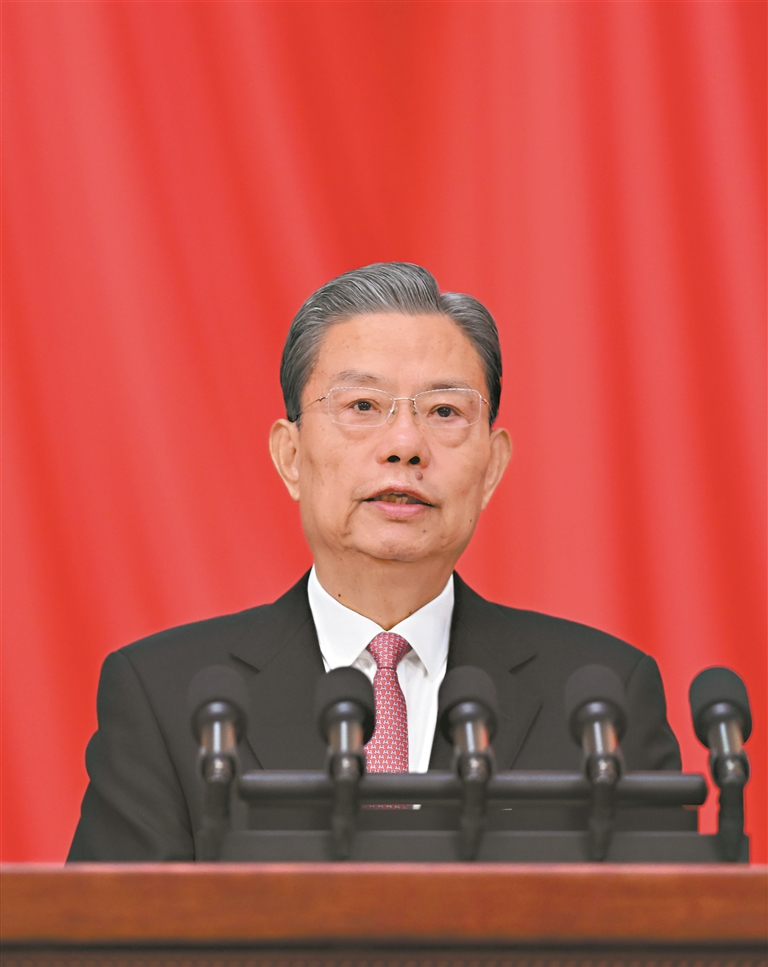 3月9日,十四届全国人大四次会议在北京人民大会堂举行第二次全体会议。受全国人大常委会委托,赵乐际委员长向大会报告全国人大常委会工作。       新华社发