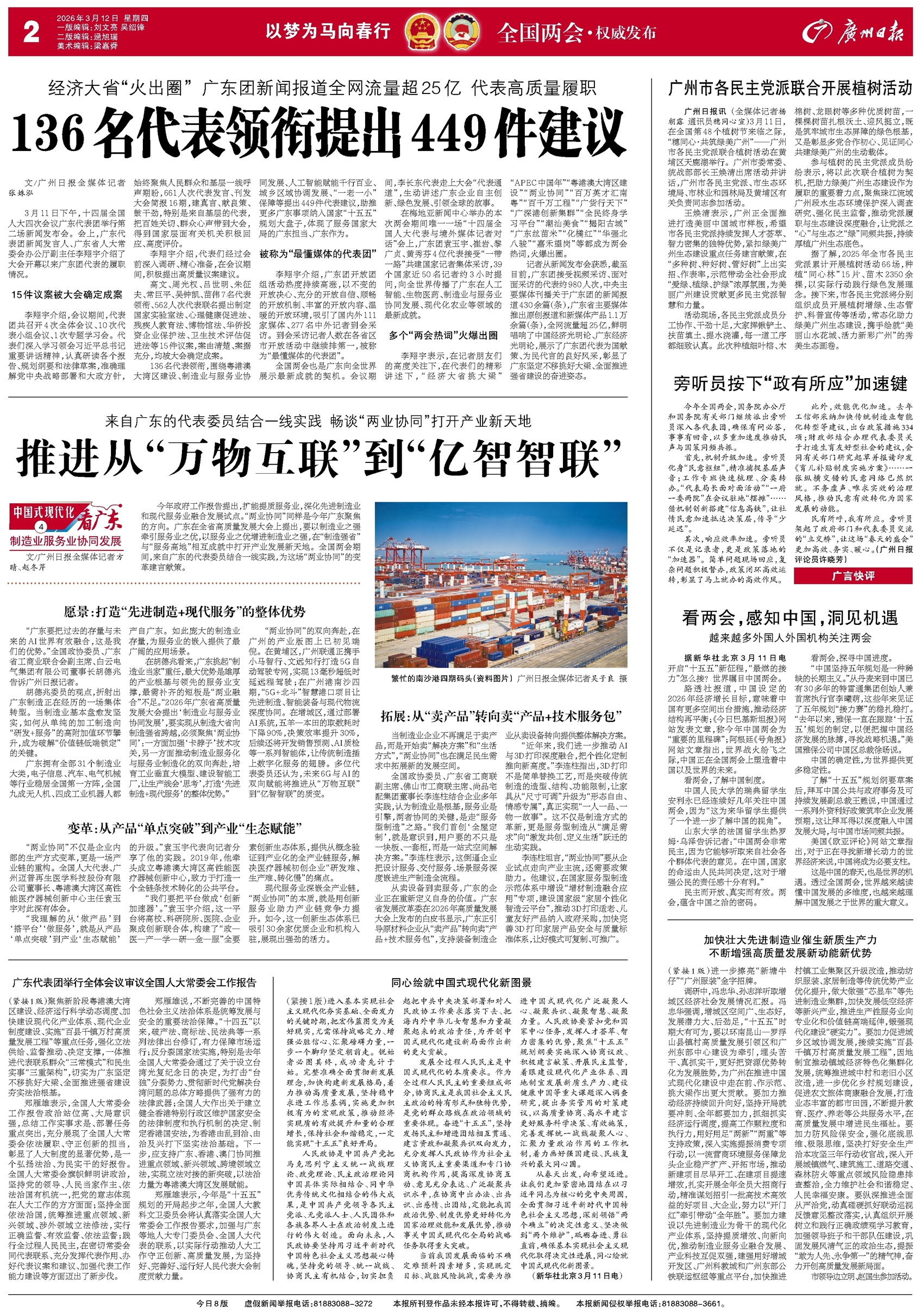 - 广东代表团举行全体会议审议全国人大常委会工作报告 (紧接1版)聚焦新阶段粤港澳大湾区建设、经济运行科学动态调度、加快建设现代化产业体系、现代企业制度建设、实施“百县千镇万村高质量发展工程”等重点任务,强化立法供给、监督推动、决定支撑,一体推进代表