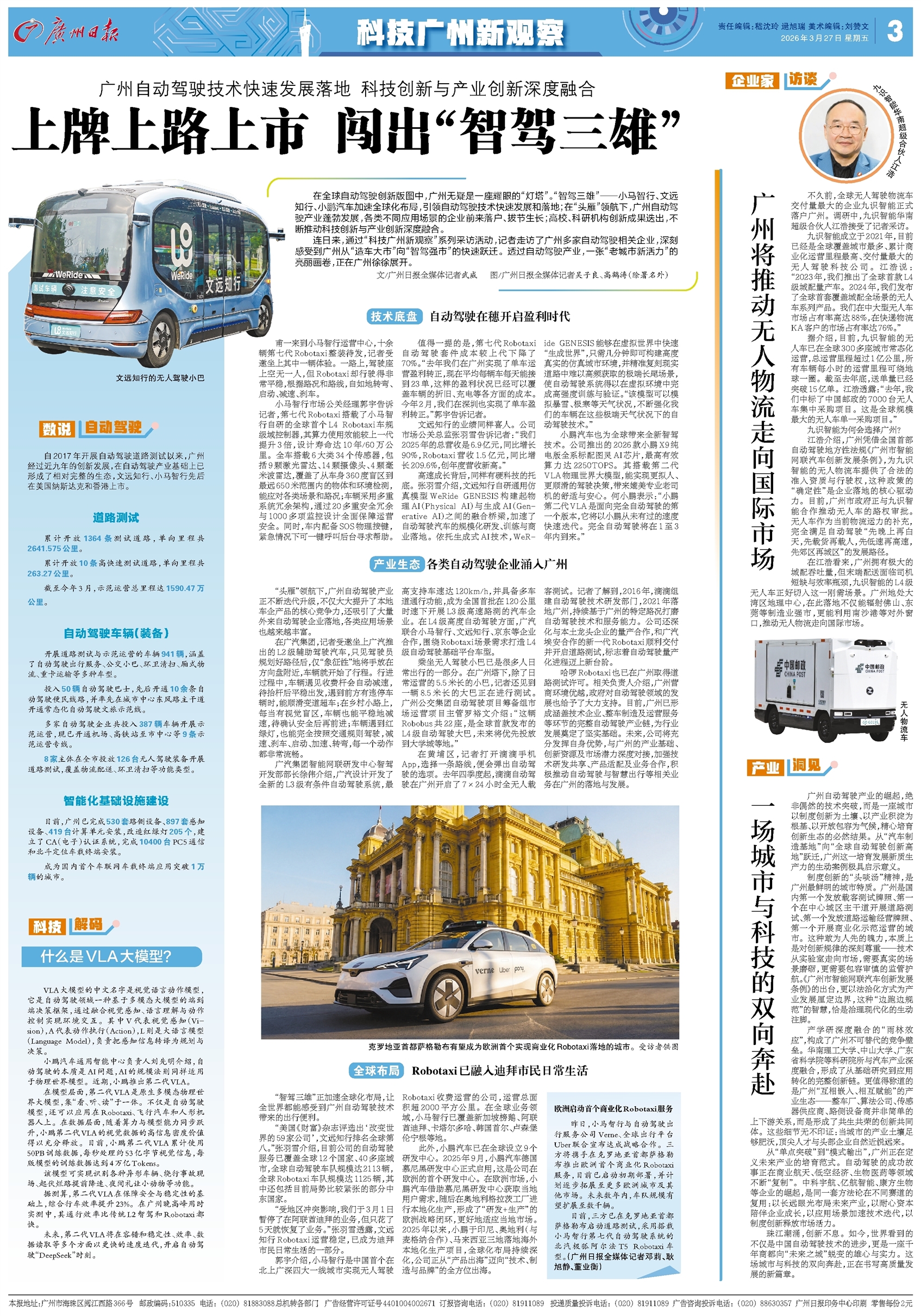 在全球自动驾驶创新版图中,广州无疑是一座耀眼的“灯塔”。“智驾三雄”——小马智行、文远知行、小鹏汽车加速全球化布局,引领自动驾驶技术快速发展和落地;在“头雁”领航下,广州自动驾驶产业蓬勃发展,各