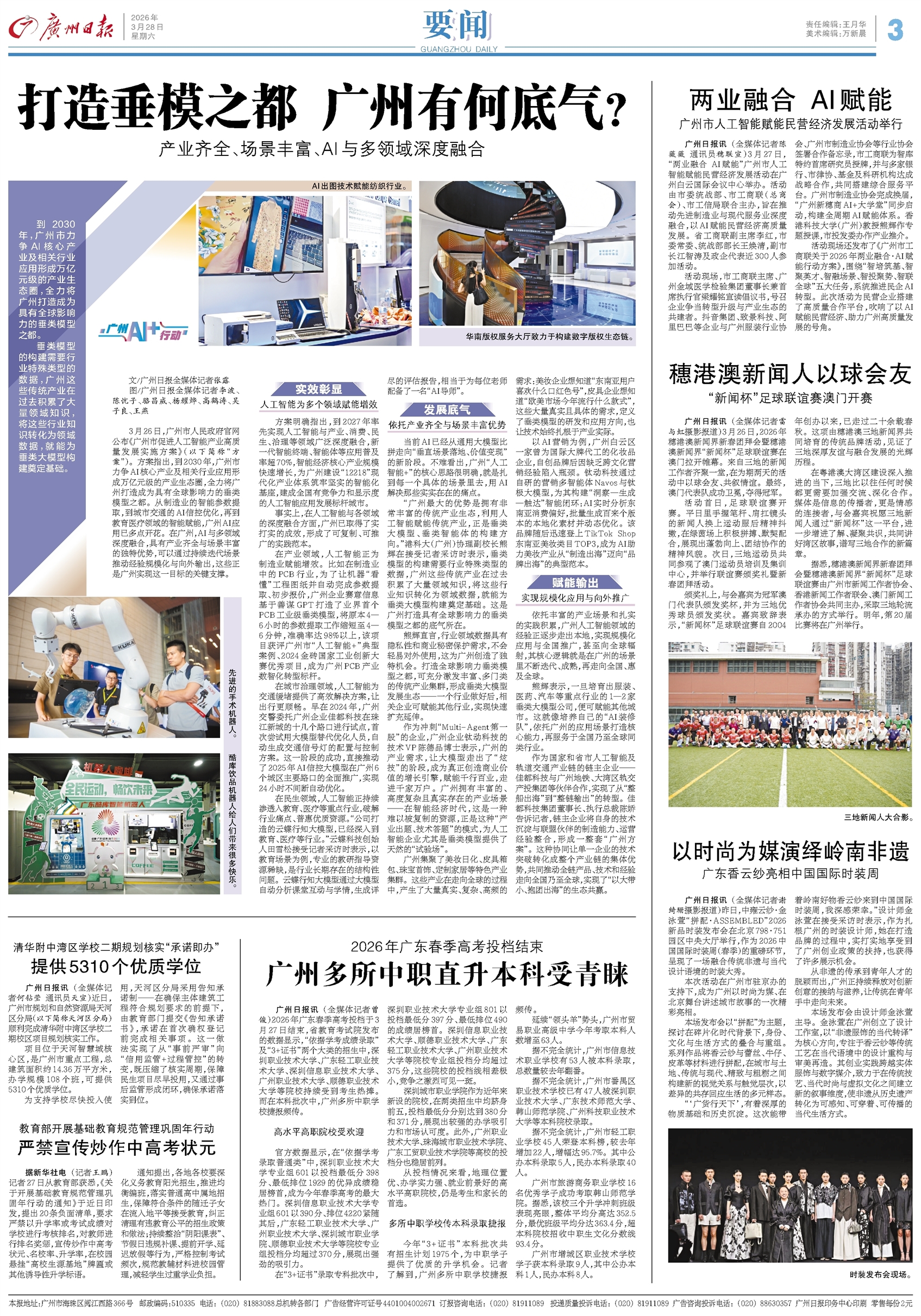 - 两业融合 AI赋能 广州日报讯 (全媒体记者陈薇薇 通讯员穗联宣)3月27日,“两业融合 AI赋能”广州市人工智能赋能民营经济发展活动在广州白云国际会议中心举办。活动由市委统战部、市工商联(总商会)、市工信局联合主办