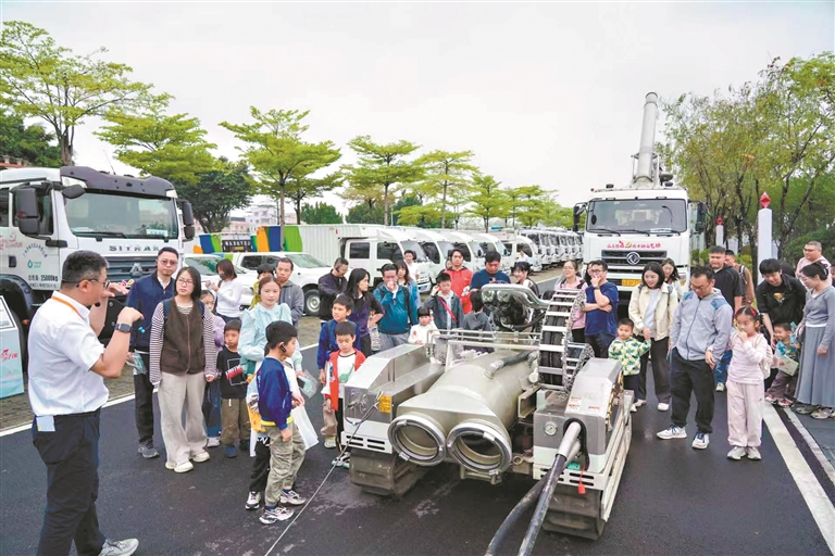 水务开放日环节,“龙吸水”排涝车、小型清疏设备等先进水务设备整齐陈列,工作人员现场讲解其功能和应用场景,让市民近距离感受广州水务的科技实力。现场设置的高品质净水机体验区吸引了众多市民参与,该设备搭载四级精滤系统,可满足家庭多元用水需求,目前已在多个楼盘和公共场所推广,切实提升了市民用水幸福感。