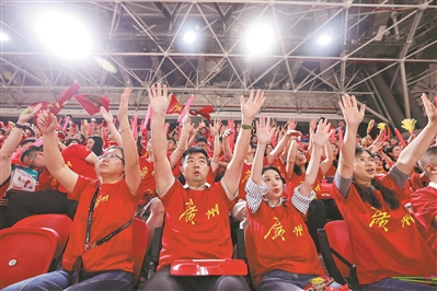高职二年级篮球专项学生王泳圳和同学们一起到场组成助威团,他表示,这是他连续两场比赛现场为广州队加油,上一场球员和球迷都已经拼尽全力,今天大家用一场胜利证明了自己的实力,广州队赛出了风格,赛出了精神,赛出了实力。