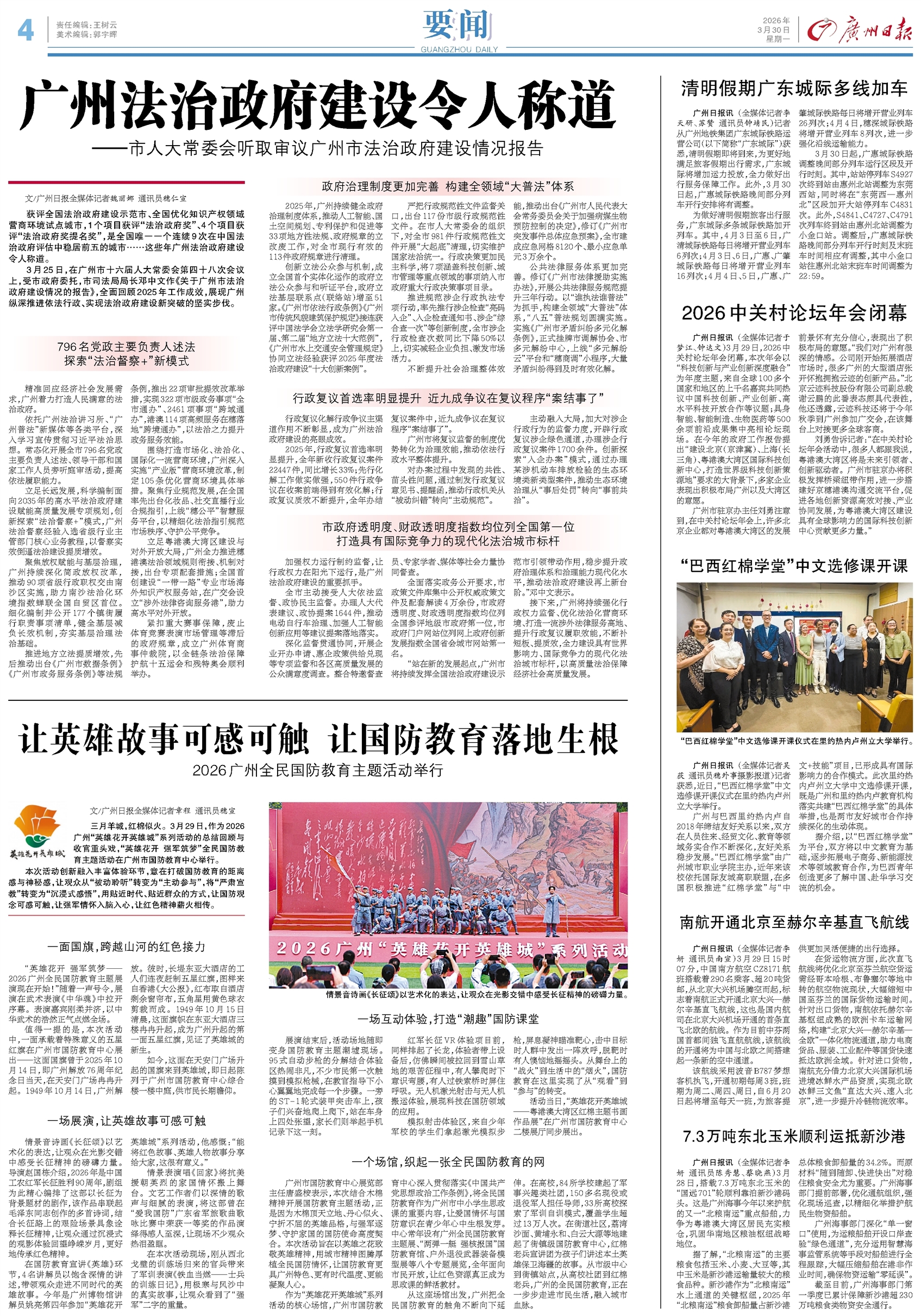 - 让英雄故事可感可触 让国防教育落地生根 英雄花开英雄城 文/广州日报全媒体记者章程 通讯员穗宣 三月羊城,红棉似火。3月29日,作为2026广州“英雄花开英雄城”系列活动的总结回顾与收官重头戏,“英雄花开 强军筑梦”全民国防教育