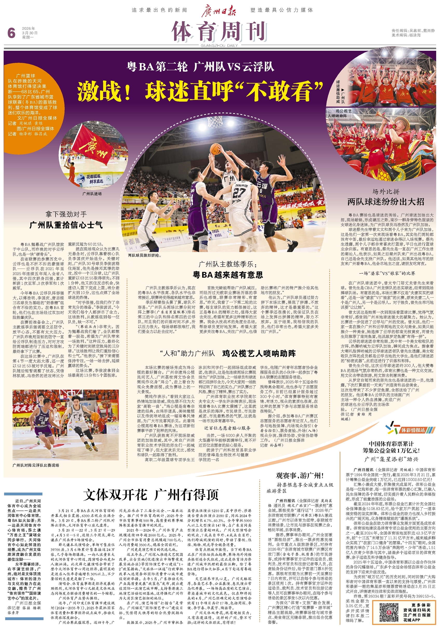 - 激战!球迷直呼“不敢看” 广州篮球队在昨晚的天河体育馆打得坚决果断——68比65,广州队拿到了广东省城市篮球联赛(粤BA)的首场胜利,整个体育馆变成了球迷们欢乐的海洋。 文/广州日报全媒体记者 周婉琪 黄维 图/广