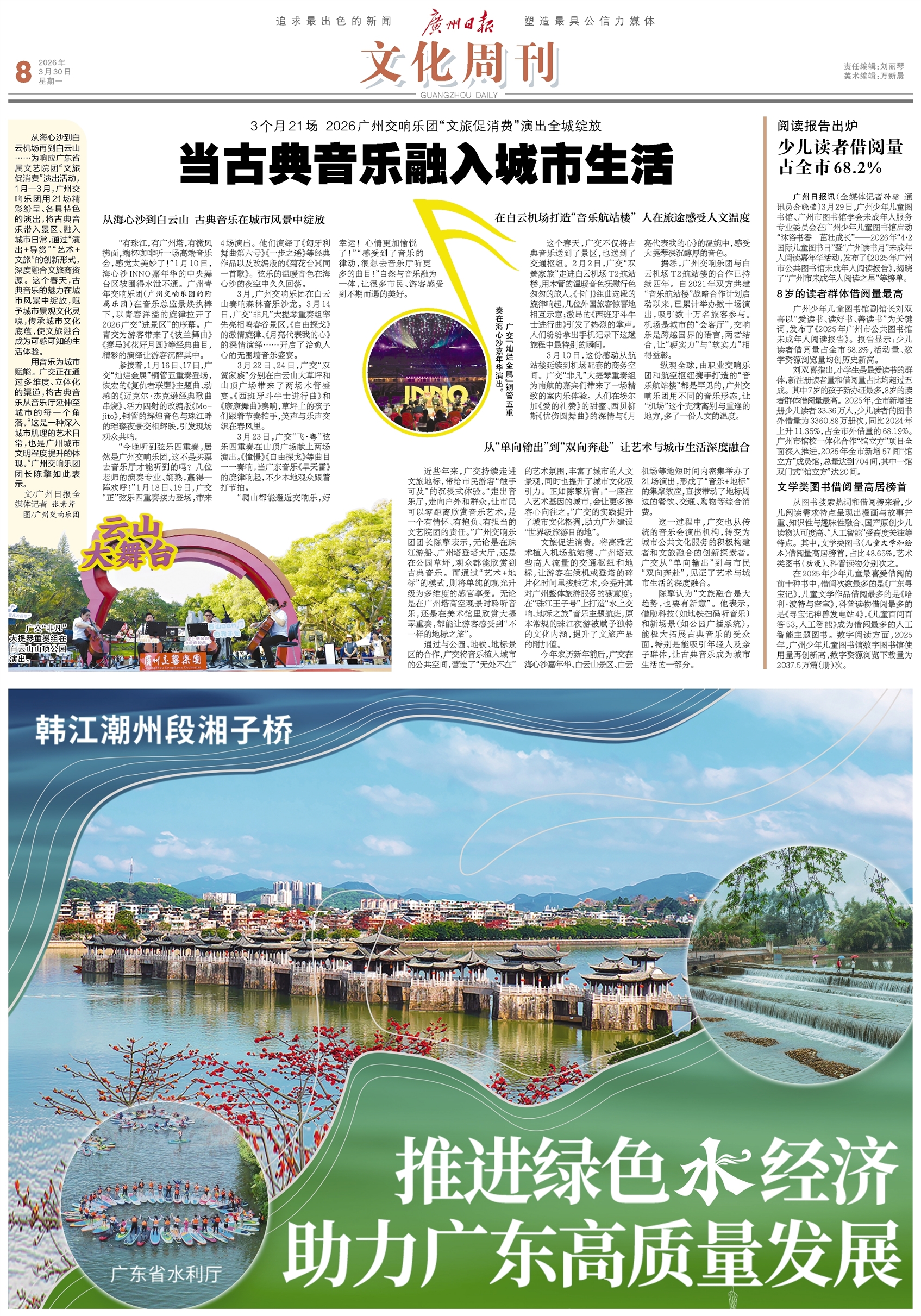 - 当古典音乐融入城市生活 从海心沙到白云机场再到白云山……为响应广东省属文艺院团“文旅促消费”演出活动,1月—3月,广州交响乐团用21场精彩纷呈、各具特色的演出,将古典音乐带入景区、融入城市日常,通过“演出+导赏”“艺术