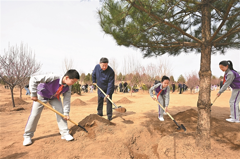 挥锹铲土、培土围堰、提水浇灌……习近平接连种下油松、北京牡丹、榆叶梅、杜仲、元宝枫等多棵树苗。他一边植树,一边询问孩子们的学习生活、劳动锻炼和参加植树情况。习近平强调,青少年像小树苗一样充满活力和希望,要从小树立远大志向,爱知识、爱劳动、爱自然,德智体美劳全面发展,努力成长为栋梁之材。现场气氛热烈,一派繁忙景象。