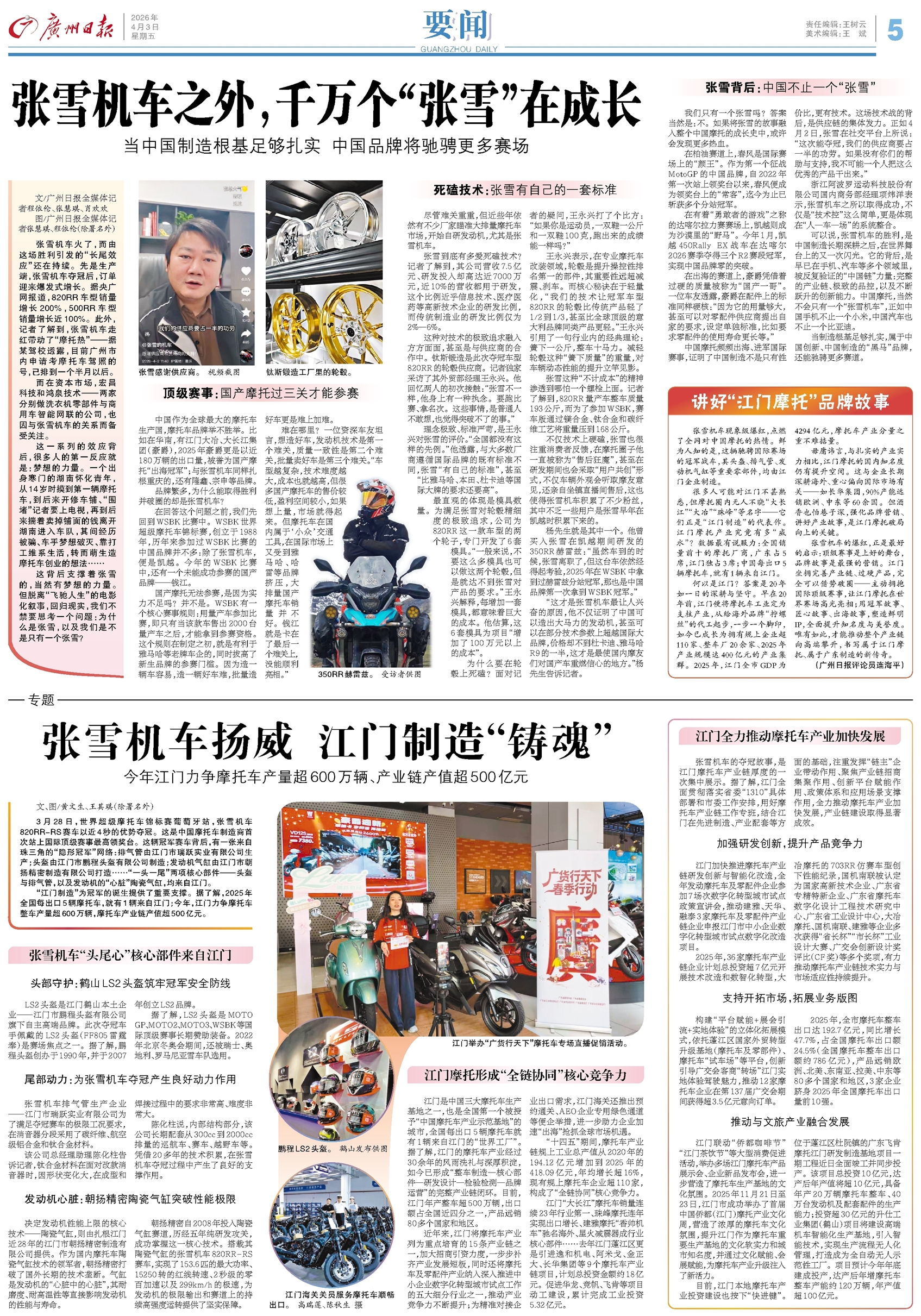 - 讲好“江门摩托”品牌故事 张雪机车现象级爆红,点燃了全网对中国摩托的热情。鲜为人知的是,这辆驰骋国际赛场的冠军战车,其头盔、排气管、发动机气缸等重要零部件,均由江门企业制造。 很多人可能对江门不甚熟悉,但摩托圈内无人不