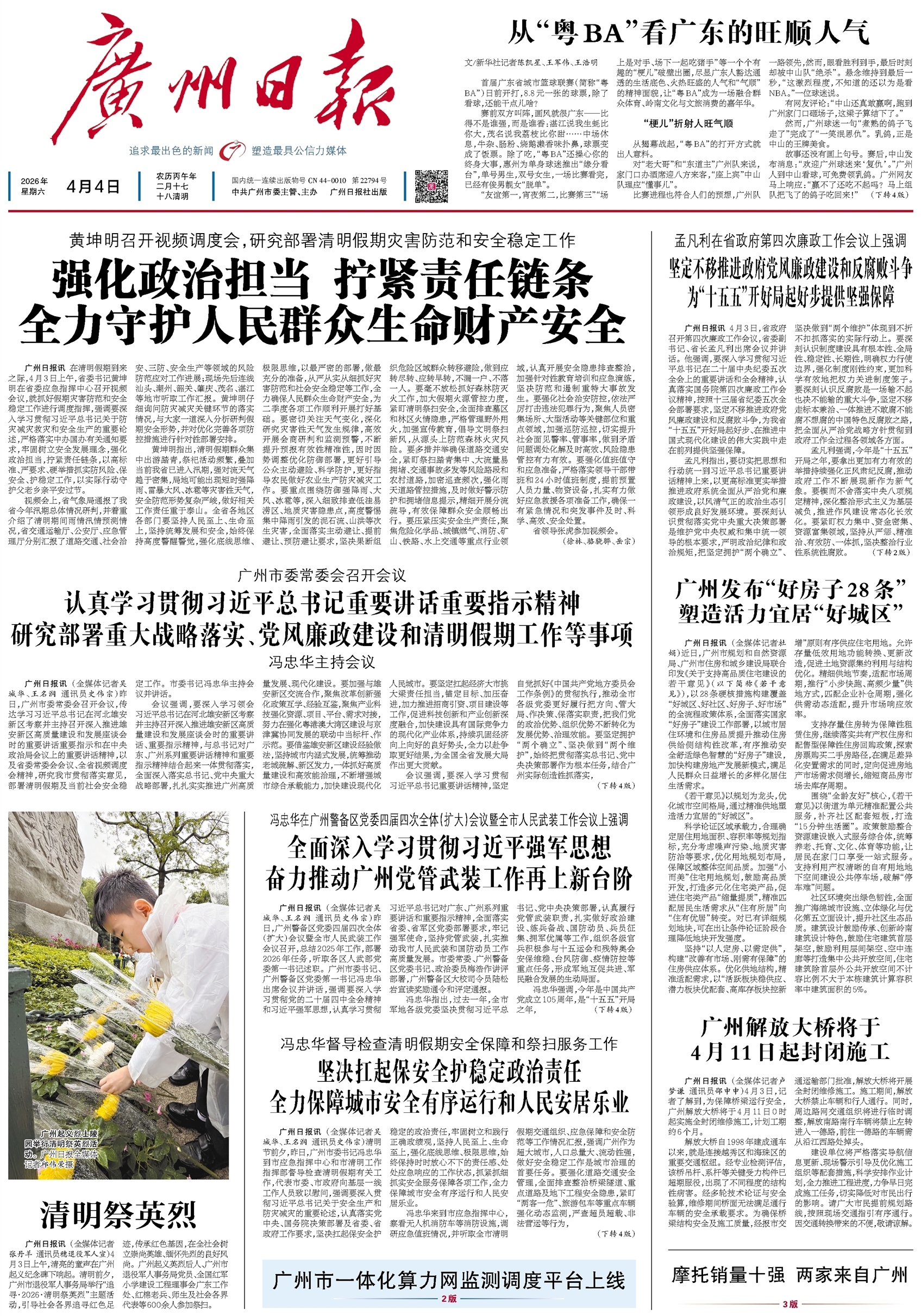 - 认真学习贯彻习近平总书记重要讲话重要指示精神研究部署重大战略落实、党风廉政建设和清明假期工作等事项 广州日报讯 (全媒体记者吴城华、王名润 通讯员史伟宗)昨日,广州市委常委会召开会议,传达学习习近平总书记在河北雄安新区考察并主持召开深入推进雄安新区高质量建设和发展座谈会时的重要讲话重要指示和在中