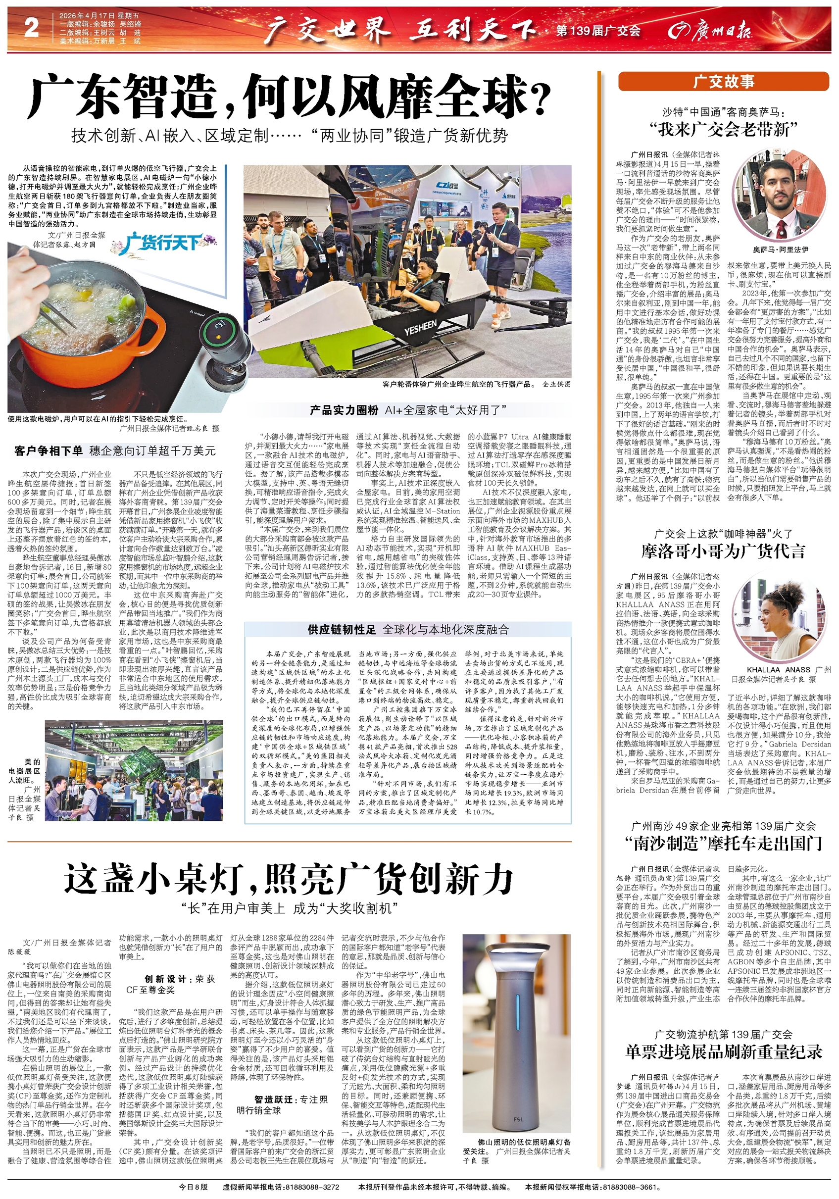 从语音操控的智能家电,到订单火爆的低空飞行器,广交会上的广东智造持续刷屏。在智慧家电展区,AI电磁炉一句“小德小德,打开电磁炉并调至最大火力”,就能轻松完成烹饪;广州企业晔生航空两日斩获180架飞行器意向订单,企业负责人在朋友圈笑称:“广交会首日,订单多到九宫格都放不下啦。”制造业当家,服务业赋能,“两业协同”助广东制造在全球市场持续走俏,生动彰显中国智造的强劲活力。