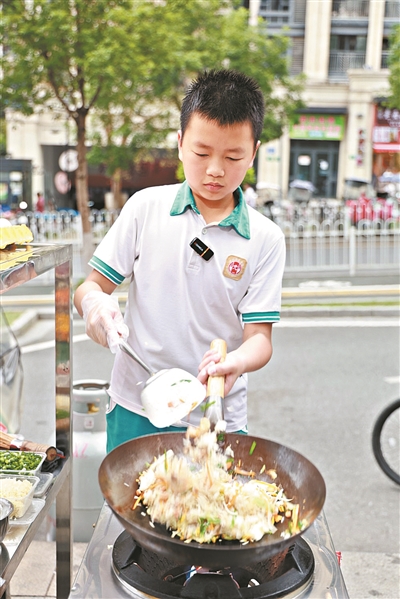 卢子川正专注于眼前的一锅炒饭。豆芽下锅、萝卜丝入味、大火颠勺,动作行云流水。“每天下午4点半放学,我就先回店里写作业,写完了就出来帮忙。”卢子川说,“去年10月开始学的,看着爸爸炒粉觉得很有意思,爸爸就教我怎么判断生熟,怎么控制火候,我就尝试着炒了起来。”
