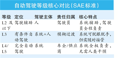 L3级自动驾驶是美国汽车工程师学会(SAE)J3016分级体系中的关键节点,我国自动驾驶分级基本参考该体系。从L0到L5,行业普遍认为数字越大能力越强,但这套体系的真正分水岭并非能力强弱,而是“责任划分”,这也是L3引发争议的核心原因。