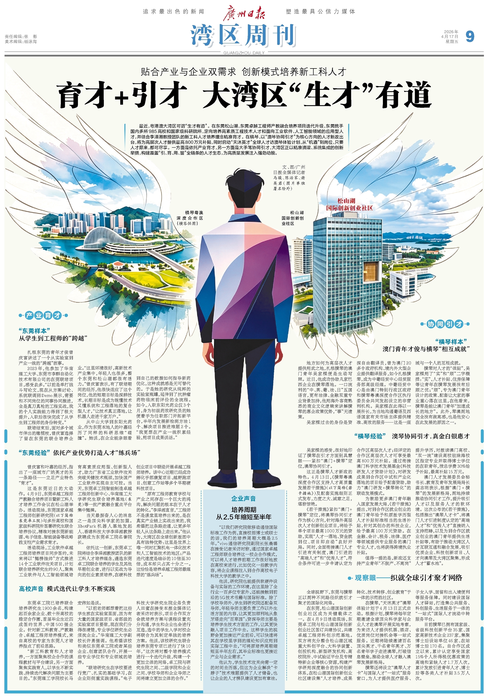 最近,粤港澳大湾区可谓“生才有道”。在东莞松山湖,东莞卓越工程师产教融合培养项目迭代升级,东莞携手国内多所985高校和国家级科研院所,定向培养高素质工程技术人才和面向工业软件、人工智能领域的应用型人才,并结合李泽湘教授团队的新工科人才培养理念精准育才。在横琴,以“澳琴协同引才”为核心方向的人才新政出台,将为高层次人才提供最高800万元补贴,同时启动“天沐英才”全球人才访澳琴体验计划,从“机酒”到岗位,只要人才愿来,都可尽享。一方面是依托产业育才,另一方面是大手笔协同引才,大湾区正以精准滴灌、系统集成的创新举措,构建覆盖“引、育、用、留”全链条的人才生态,为高质量发展注入强劲动能。