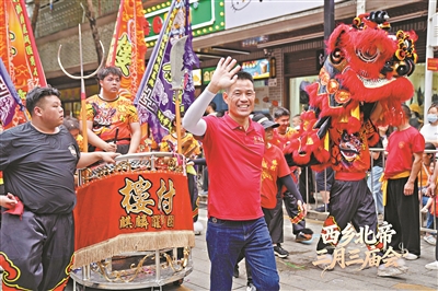 揭阳潮乐团已是第四次参加“西乡北帝三月三庙会”。该乐团领队带着9岁的儿子登上了巡游表演车。他告诉记者,乐团每次来都会有创新,希望在创新中传承好非遗。
