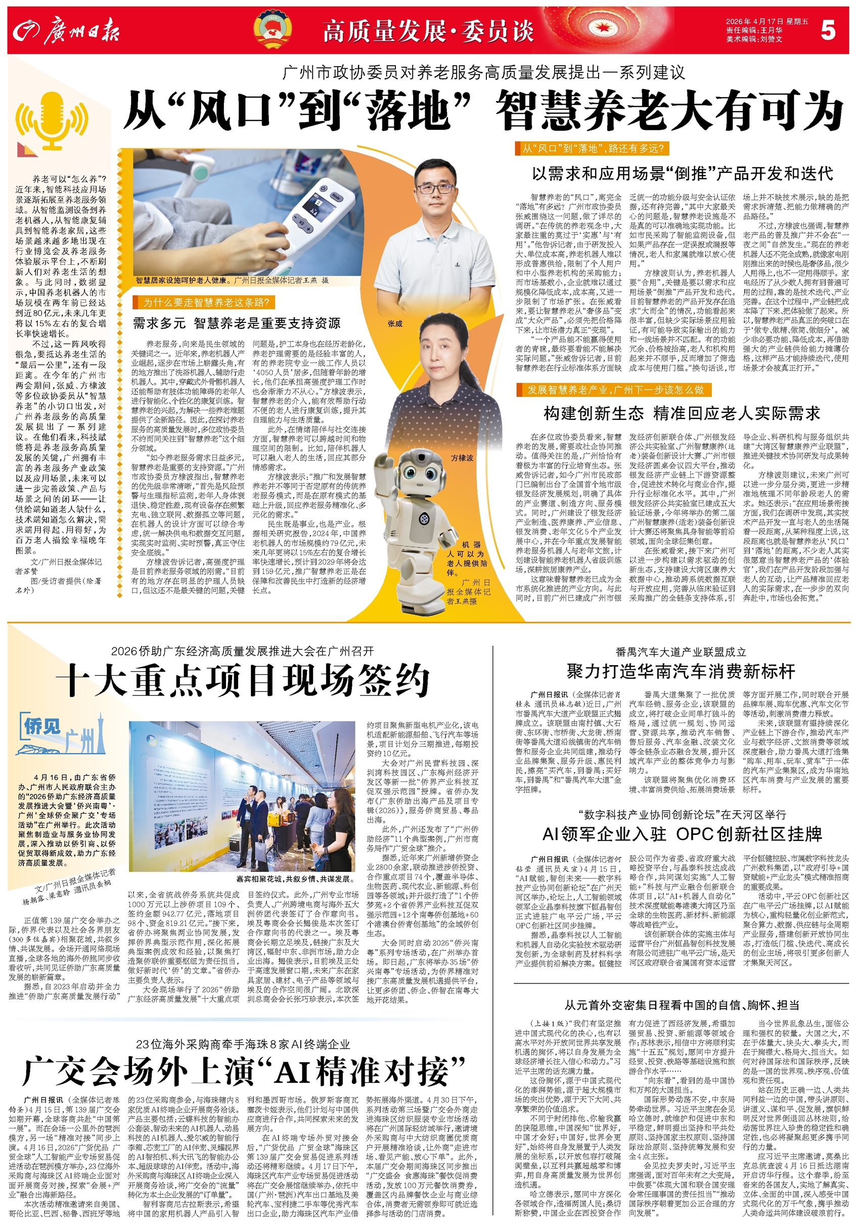 - 十大重点项目现场签约 侨见广州 4月16日,由广东省侨办、广州市人民政府联合主办的“2026侨助广东经济高质量发展推进大会暨‘侨兴南粤’·广州‘全球侨企聚广交’专场活动”在广州举行。此次活动聚焦制造业与服务业协同发